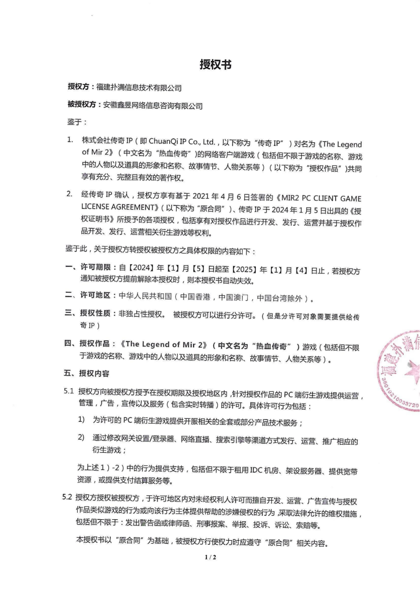 關(guān)于對《The Legend of Mir 2》(熱血傳奇) 衍生品游戲直播的嚴正聲明